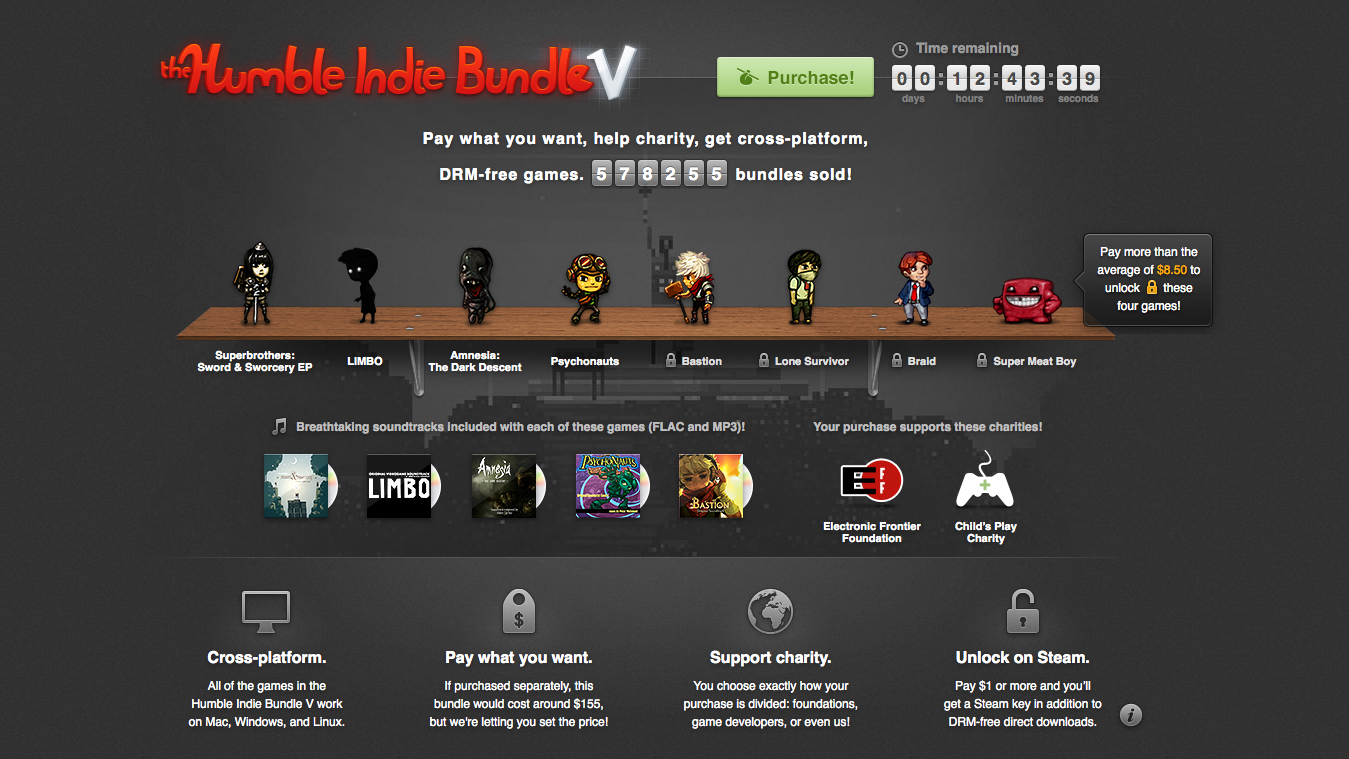 Soit! Cette année encore leur bundle nous propose des jeux forts sympathiques comme l'incontournable Limbo, Amnesia ou encore Superbrothers! C'est vous fixez un prix (une vingtaine d'euros, c'est déjà chic) et vous accèderez au téléchargement de 8 jeux multiplateformes avec leur OST respectives (FLAC/mp3) et sans DRM! :3