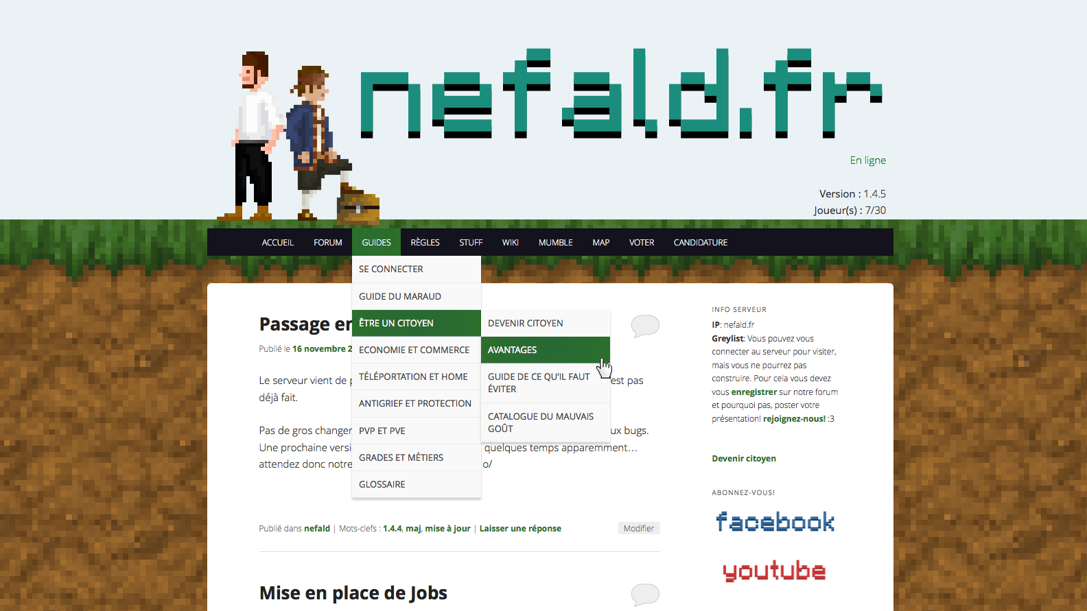 Cette reconfiguration concerne principalement la visibilité des guides mais vous retrouverez aussi dans l'onglet stuff un lien sur les billets techniques ( là où je consigne toutes les mises à jour et modification du serveur minecraft ), un autre vers le sujet de mises à jour des règles - ne le manquez pas - le tout au milieu des liens utiles, comme les votes! \o/