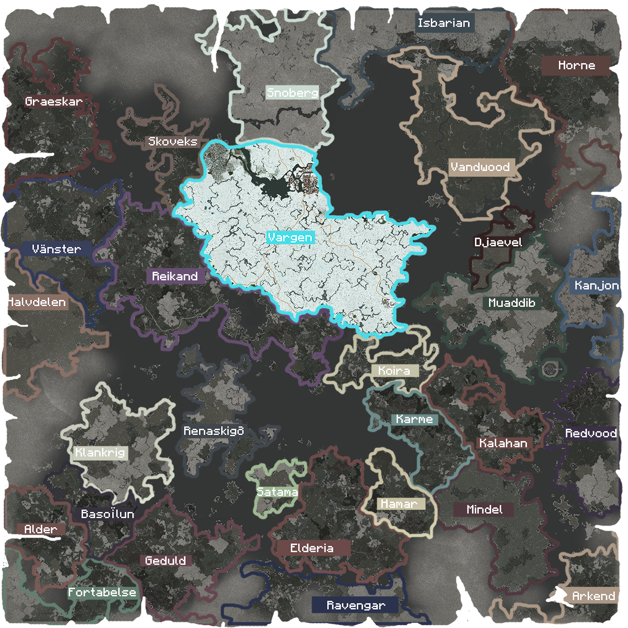 Je viens de refaire les cartes des Territoires d'Harlan,vous trouverez celles-ci sur le wiki dans l'onglet Cartes. Outre une carte globale référençant l'ensemble des territoires, une carte a été réalisée par territoire (ex.: Värgen).